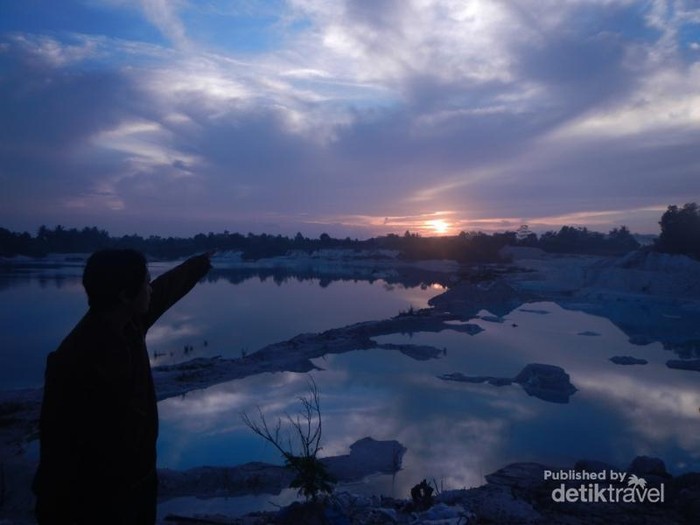 Berfoto dengan latar sunrise di Danau Kaolin