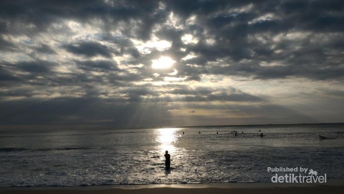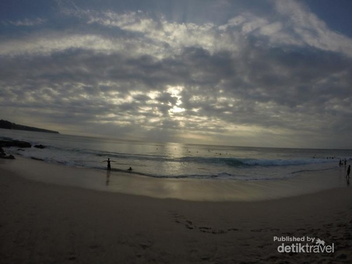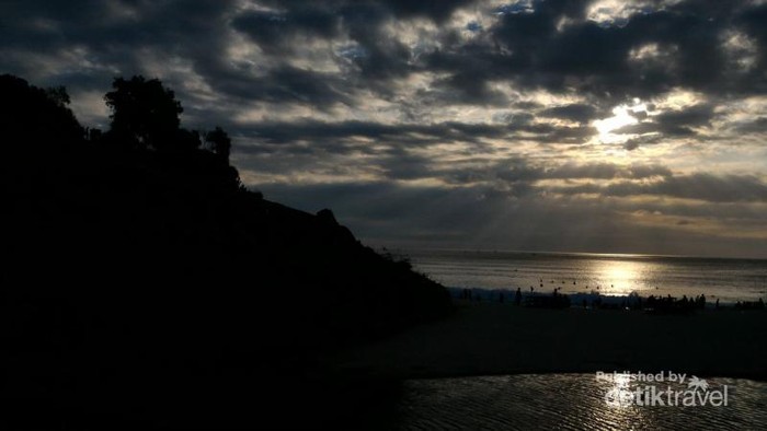 Awan mendung membuat sore itu di Pantai Dreamland tidak menampakan sunset yang ciamik, tapi justru barisan barikade awan yang dilewati sinar matahari tetap terlihat cantik loh.