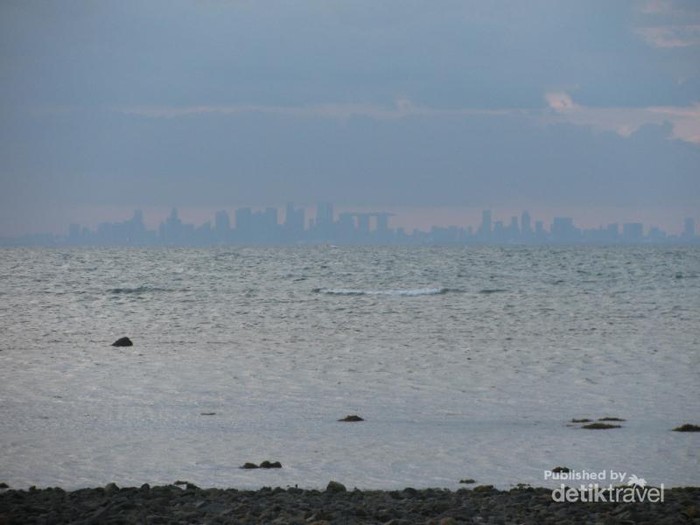 Di belakang pulau ini kita bisa melihat gedung-gedung pencakar langit Singapura.