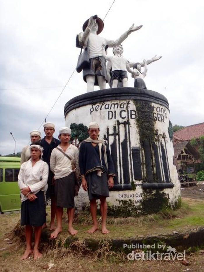 Tugu selamat datang di Ciboleger. Ketika turun dari angkot, sekelompok laki-laki berbadan tegap dengan baju hitam putih akan menyambut kedatangan tamu.