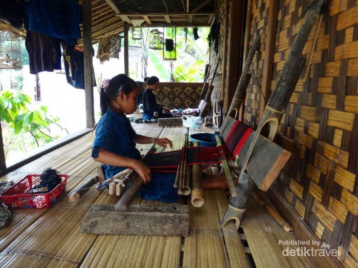 Anak perempuan di Baduy diajarkan menenun sejak kecil. Tenun ini akan dijual dan merupakan salah satu mata pencaharian mereka.