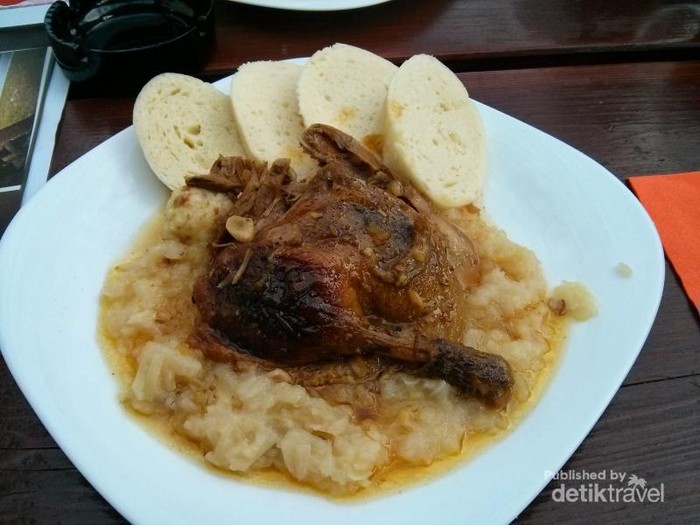 Ayam yang disajikan bersama dengan dumpling, makanan khas Ceko
