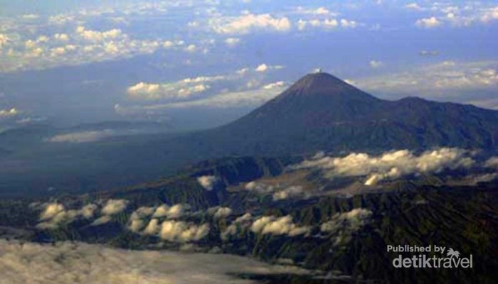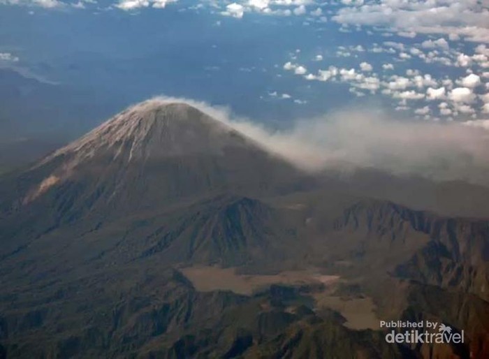 Pose Semeru denganciri ciri khasnya. Momen langka ini mengandalkan kecerahan cuaca di ketinggian 30.000 feet penerbangan Denpasar - Jakarta