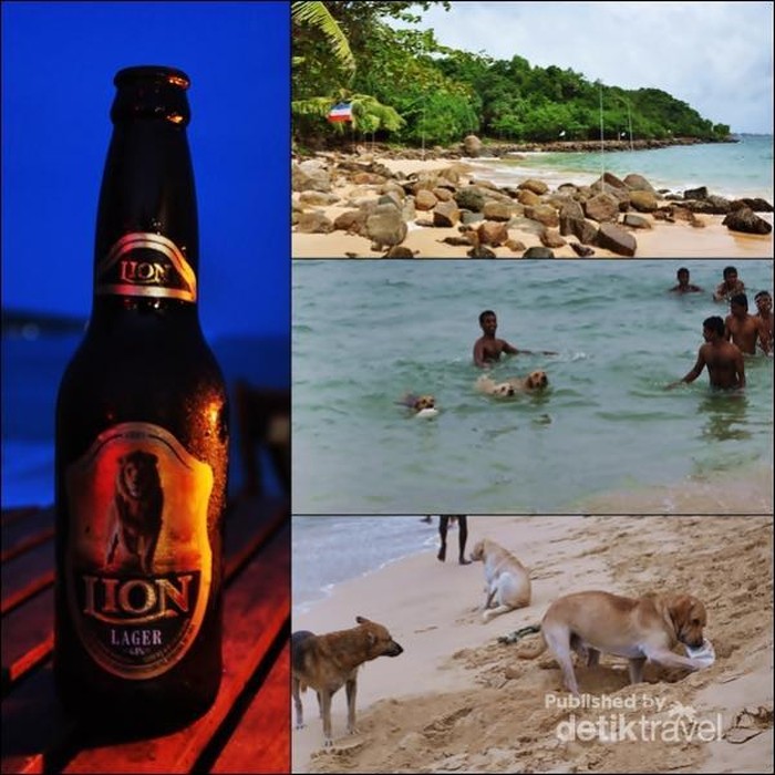 Anjing mengejar bola di Pantai Unawatuna Beach, pemandangan biasa di sore hari. Lion Beer adalam buatan Sri Lanka