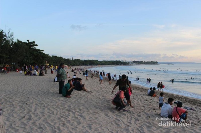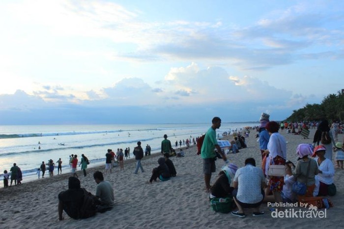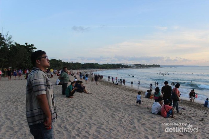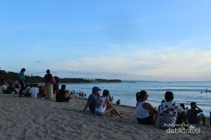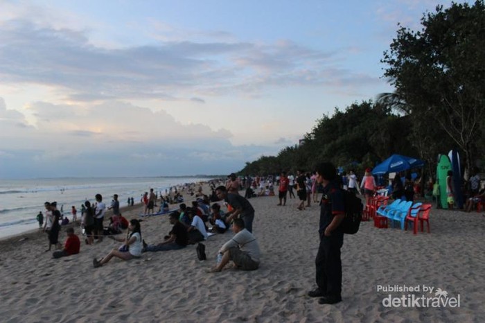 Hari mulai gelap, wisatawan pun mulai duduk di sepanjang bibir pantai. Kebanyakan wisatawan menunggu matahari terbenam.