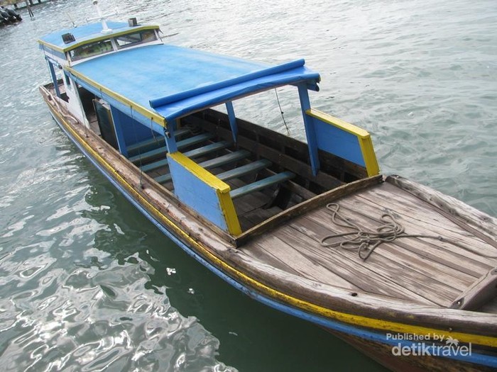 D'Travelers harus naik perahu kecil yang masyarakat sana menyebutnya Pompong