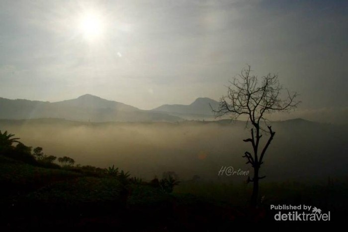 Matahari bersinar fokus kala pagi yang dramatis di bagian atas daerah Caringin Tilu, Bandung