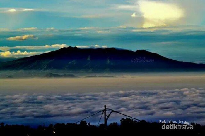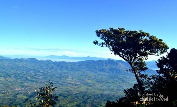 Terlihat samar-samar di ujung depan itu Gunung Burangrang dan Tangkuban Perahu dengan cekungan Bandung yang masih berselimut kabut yang terlihat dari Puncak Cikuray, Garut