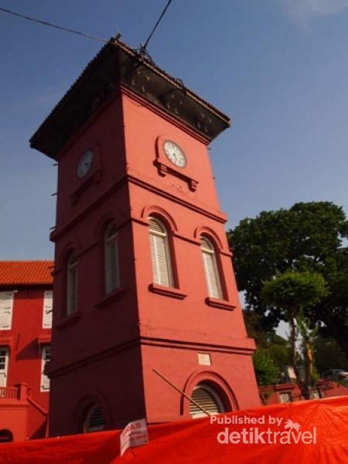 Menara jam di depan gereja. Seperti bangunan lainnya, warna jam juga ikut merah