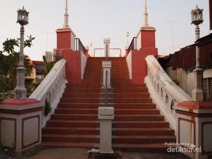 Tangga jembatan penyeberangan melintasi Sungai Melaka juga berwarna merah
