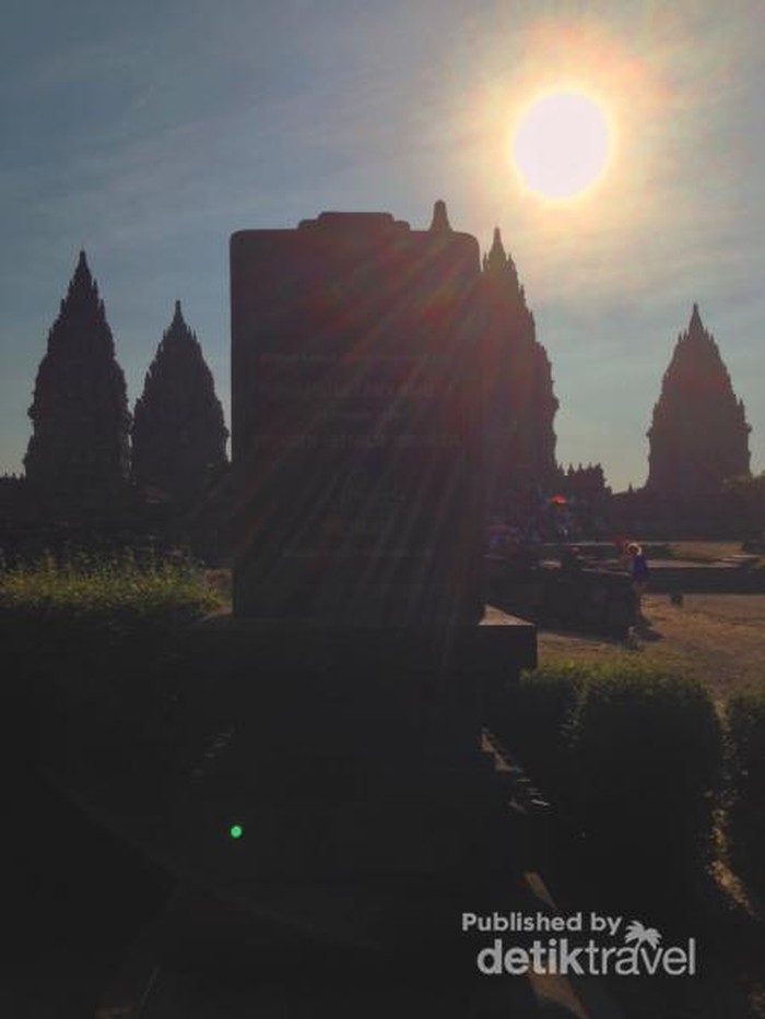 Mentari sore menjelang terbenam menyinari prasasti Candi Prambanan.