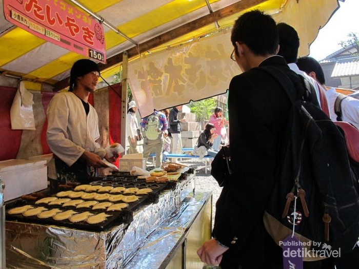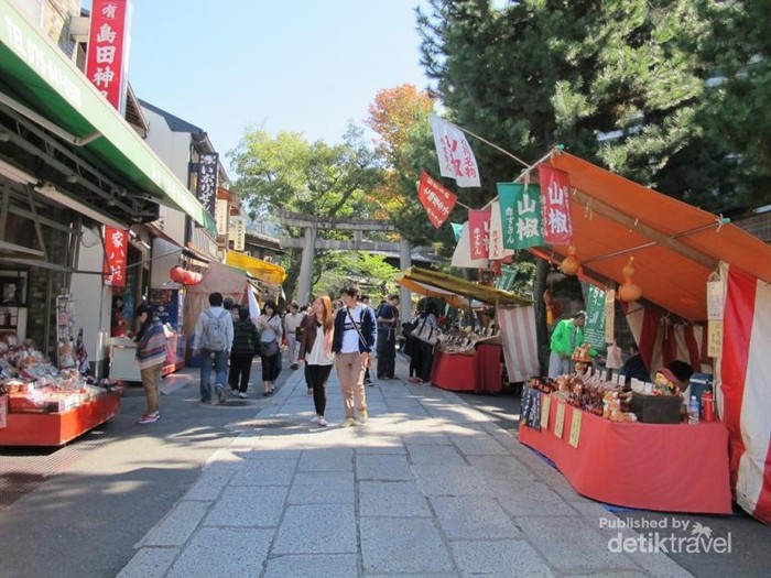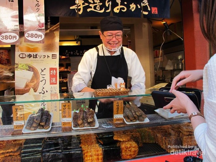 Sepanjang jalan menuju kuil Fushimi Inari yang dipenuhi dengan jajanan ala Negeri Jepang. Namun, memang harga yang ditawarkan oleh penjual cenderung lebih mahal karena berada di area wisata.
