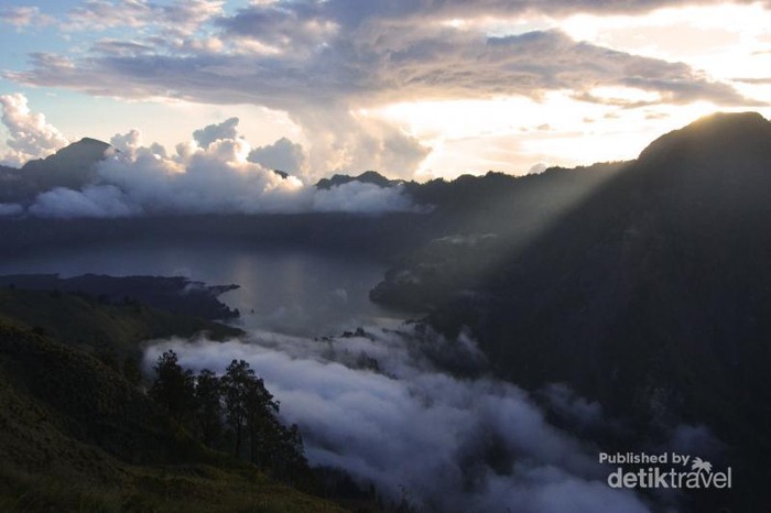 Pemandangan dari plawangan, panorama Danau Segara Anak saat sore dengan romantisme awan dan matahari senja. . Plawangan adalah tempat pendirian camp terakhir sebelum mencapai puncak Gunung Rinjani