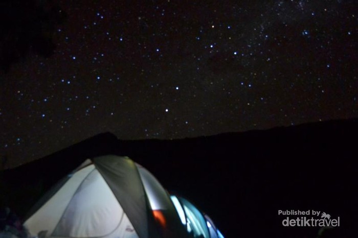Langit malam saat malam dipuncak rinjani. Langitnya Terang dan dihiasi banyak bintang-bintang .