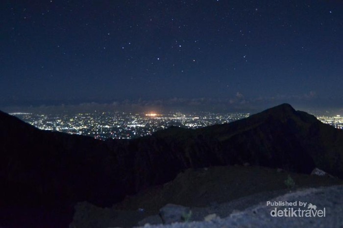 Pulau Lombok Malam Hari terlihat dari jalur menuju puncak gunung Rinjani, Bercahaya terang dari atas lereng pendakian.