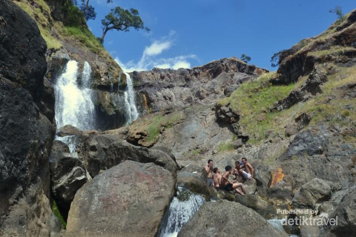 Mandi di air terjun di bawah danau Segara Anak. Tebing dinding Air Terjun ini mengeluarkan air panas belereng. Jadi bisa memelih air terjun yang dinign atau air belarang yang panas untuk mandi.