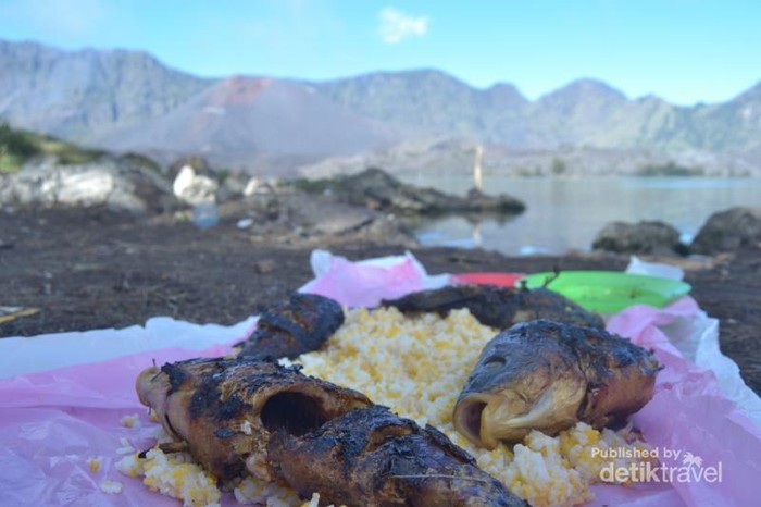 Ikan bakar hasil pancingan di danau Segara Anak . Untuk persiapan bawa bumbu masak secukupnya.