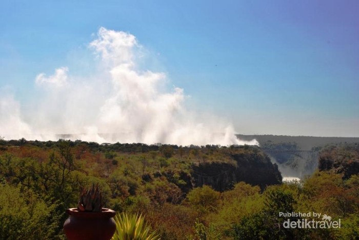 Dari beberapa kilometer, uap air dari air terjun Victoria nampak seperti awan. Uap air yang banyak tersebut langsung turun kembali menjadi hujan.