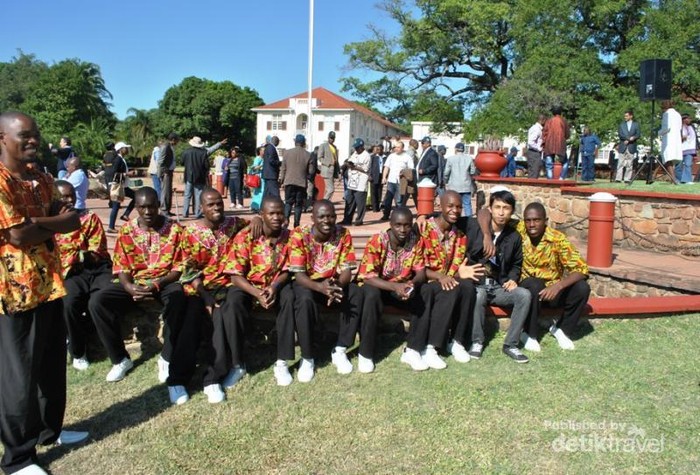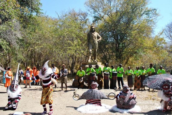 Tari tradisional di bawah patung David Livingstone, penemu Air Terjun Victoria