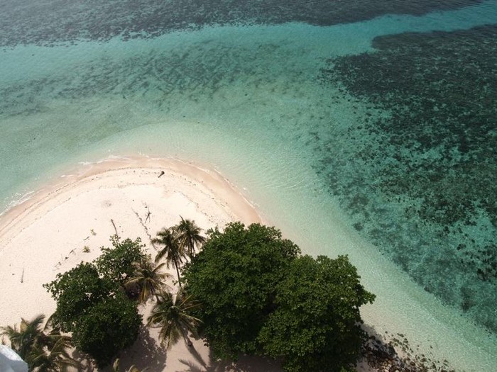 Hamparan pasir putih di pantai Pulau Lengkuas dikelilingi air laut yang jernih, terlihat sangat indah.