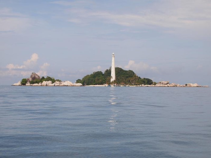 Tampak Pulau Lengkuas dengan ciri khas bangunan mercusuar yang menjulang tinggi.