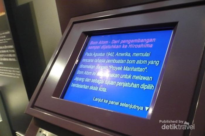 Disediakan layar sentuh yang berisi penjelasan peristiwa bom atom dalam berbagi bahasa.
