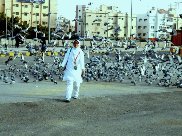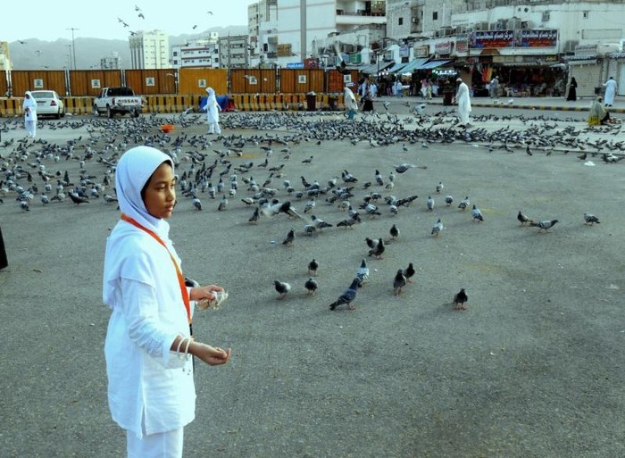 Merpati-merpati yang jinak di Madinah tak kalah indah dijadikan latar berpose putri saya dibandingkan merpati-merpati di Paris.