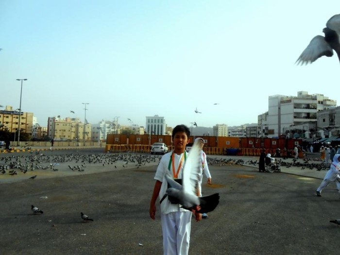 Si bungsu tak ketinggalan ikut menebarkan makanan dan bermain bersama merpati-merpati yang jinak di Madinah.