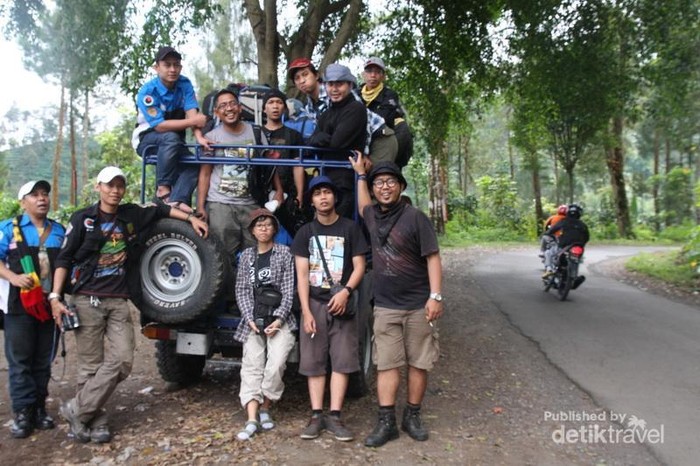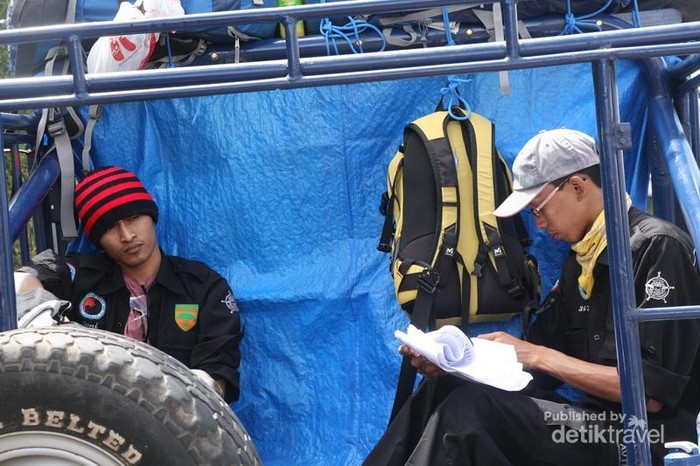 pendaki lagi kelelahan . selama 3jam perut di goyang oleh mobil jeep.jalan yang di tempuh mendaki dan berlobang
