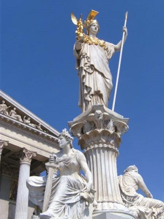 Pallas-Athena-Brunnen, monument artistik dan air mancur di depan gedung parlemen. Dewi Athena merupakan simbol kebijaksanaan.