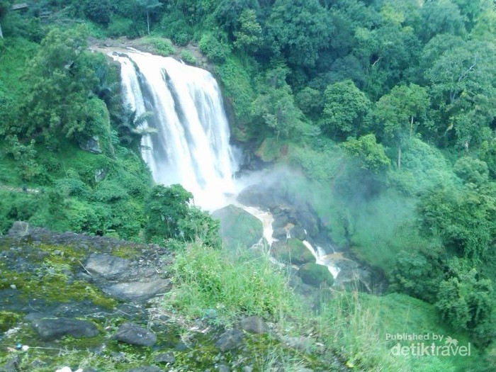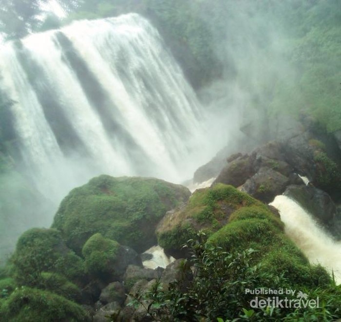 Jatuhnya air yang sangat deras membuat percikan airnya membasahi sekitar