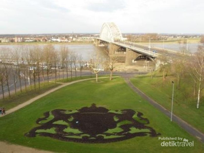 Nijmegen dibelah oleh Sungai Rhein, yang mengalir dari Jerman, sungai ini juga dilewati kapal-kapal barang yang besar-besar. Dua sisi Nijmegen dihubungkan dengan jembatan ini, dan kamu pasti tahu, orang Belanda sangat bangga dengan