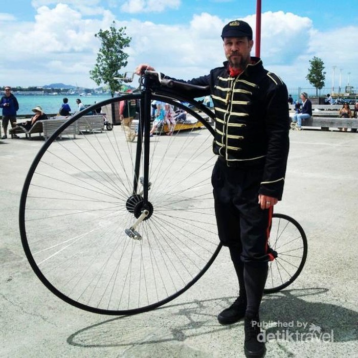 Sepeda kuno dan pengendaranya. Laut Auckland tampak di latar belakang.