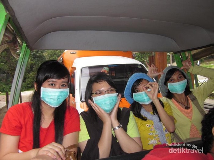 Menggunakan angkutan umum menuju Kawah Putih dari tempat parkir, siapkan masker ya!