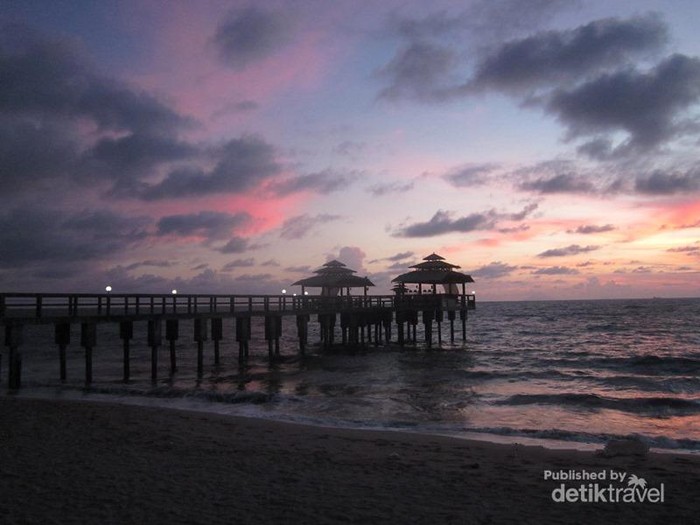 Pasir, pantai dan dermaga di rembang senja yang indah.