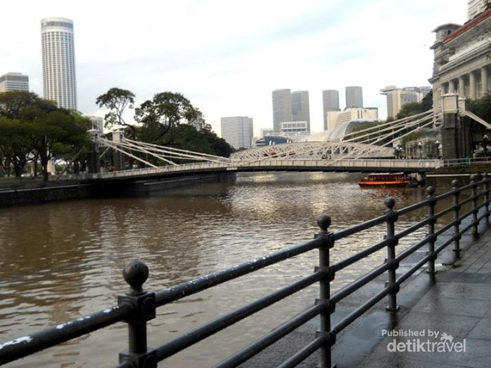 Singapore River, dengan latar belakang gedung pencakar langit dan Jembatan tua Cavanaugh bridge..