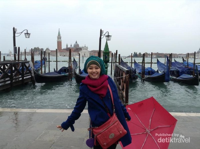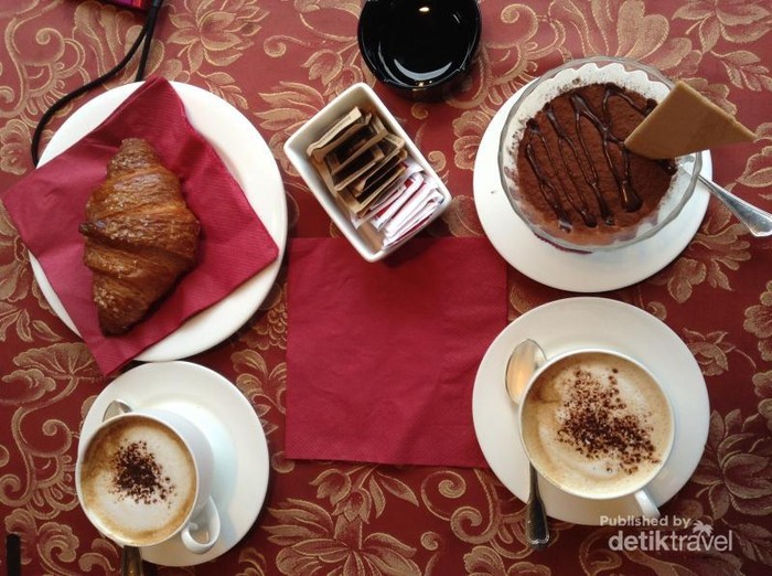 Menikmati sepotong Tiramisu dan Croissant di pinggir kanal Venezia dengan pemandangan Gondola memberikan pengalaman yang unik
