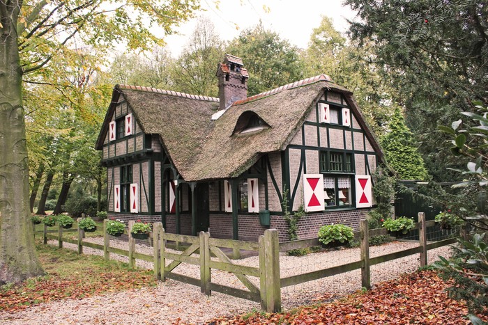 Rumah khas Belanda dengan daun-daun yang berguguran di halamannya