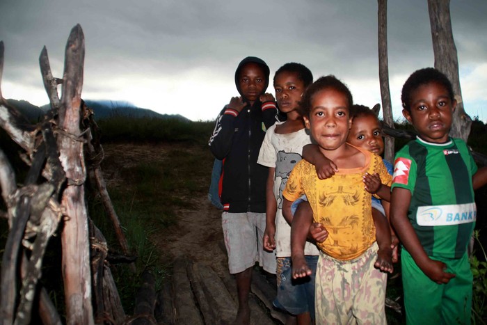 anak-anak suku obia yang sedang asik bersantai di pelataran kampung.
