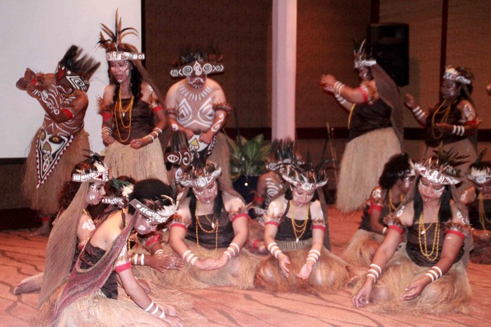 Selain bernyanyi, mereka juga melakukan koreografi tentang keseharian masyarakat papua