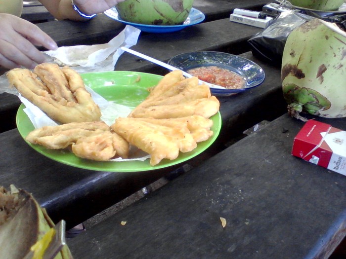 Pisang goreng pun dicocol sambal...orang manado memang penikmat pedas...
