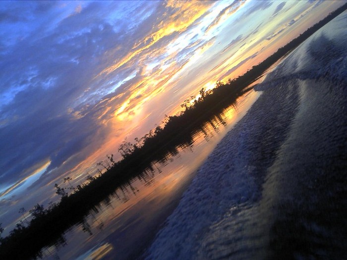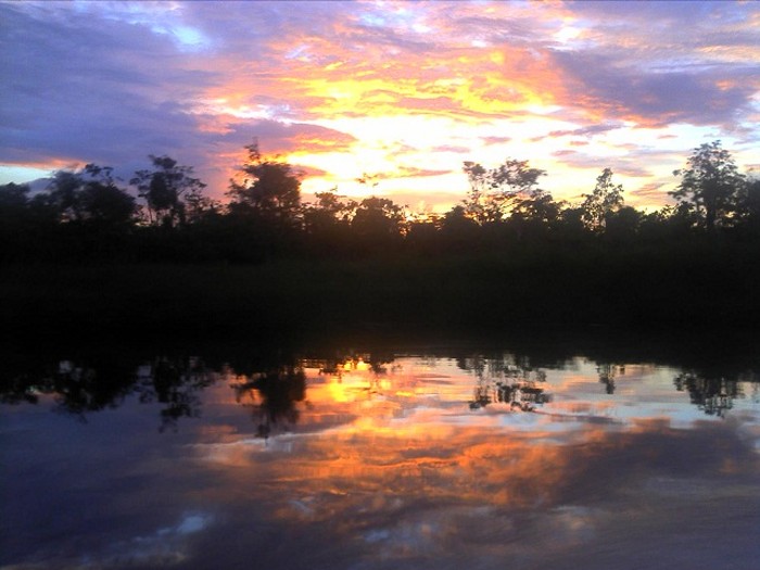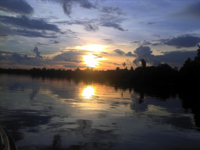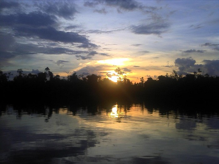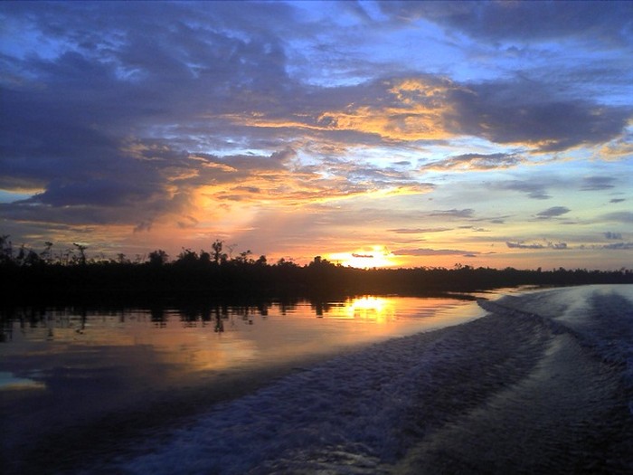 Sore menjelang malam di Sungai Wildeman, satu jam sebelum tiba di Senggo. Mentari diam-diam bersembunyi di balik pepohonan pinggiran sungai. Sebelum menuju peraduan, mentari berdandan bercermin air sungai Wildeman.Papua, 17 Oktober 2010