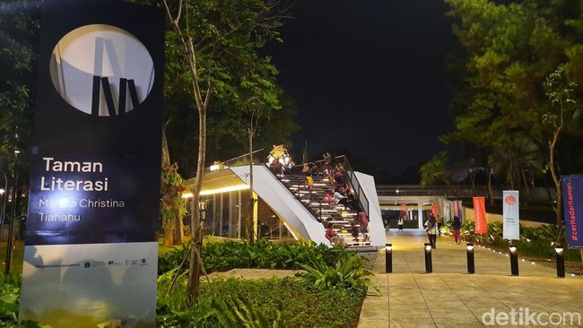 Jakarta - Taman Literasi Martha Christina Tiahahu tak hanya indah di siang hari. Coba kunjungi di malam hari, maka traveler akan disuguhi pemandangan penuh cahaya indah.