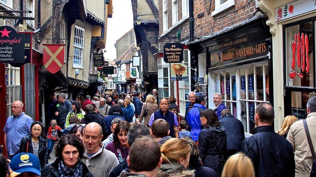 Urutan kota di Inggris Raya yang paling nyaman untuk berjalan kaki dimenangkan oleh York yang terletak di Yorkshire, Inggris. Kota ini memiliki daya tarik utama yakni jalan bernama The Shambles. Di jalan ini traveler dapat menemui banyak toko makanan, minuman, pernak-pernik, dan bangunan autentik. (Paul Buckingham/Wikimedia Commons).