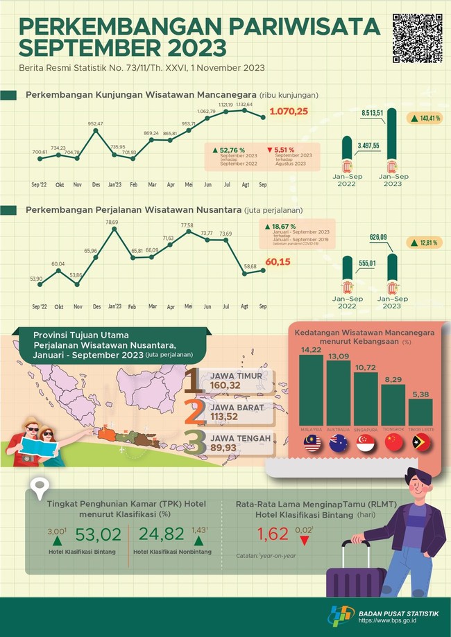 Jakarta - Badan Pusat Statistik mencatat kunjungan wisatawan mancanegara (wisman) di Indonesia pada bulan September 2023 mencapai 1,07 juta kunjungan. Jumlah ini turun 5,51 persen dibandingkan Agustus 2023 (month-to-month), tetapi mengalami kenaikan 52,76 persen dibandingkan bulan yang sama pada tahun lalu (year-on-year). Wisman yang berkunjung ke Indonesia pada September 2023 didominasi oleh wisman yang berasal dari Malaysia (14,22 persen), Australia (13,09 persen), dan Singapura (10,72 persen).