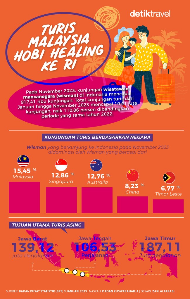 Jakarta - Wisman yang berkunjung ke Indonesia pada November 2023 didominasi oleh wisman yang berasal dari Malaysia (15,45 persen), Singapura (12,86 persen), dan Australia (12,76 persen), Kemudian China 8,23 persen dan Timor Leste 6,77 persen
