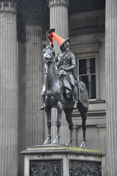 Patung Duke of Wellington yang terletak di Glasgow ini sangat nyeleneh. Bagaimana tidak? patung tersebut menampilkan penunggang kuda dimana kepalanya ditutupi oleh kerucut marka jalan.