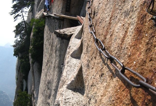 Masalah selanjutnya adalah, tidak semua jalur dalam keadaan baik. Ada beberapa jalur putus, di mana Anda harus menapaki cekungan batu di gunung tersebut. Ditambah lagi, tidak ada pembatas, hanya ada rantai yang bisa dijadikan pegangan.