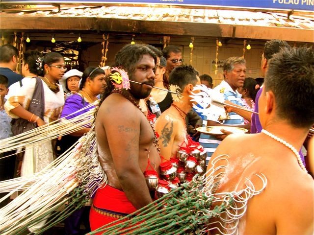 Lalu Anda disambut mereka yang menindik bibir dan hidung sampai mencucuk semua bagian tubuh dengan besi panas. Dengan keadaan seperti itu, mereka membawa kavadi (beban berat) yang diisi sesaji di atas kepala. Mereka yakin para dewa-dewi bakal senang dan memaafkan dosa mereka. Festival serupa juga dirayakan di Sri Lanka dan Afrika Selatan.