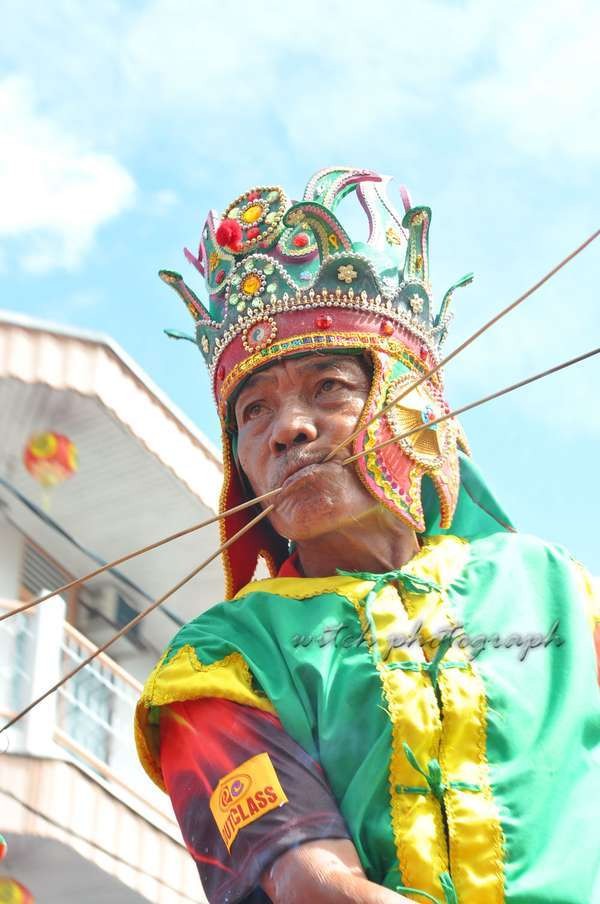 Selama jalannya acara, Anda melihat peserta festival yang menusuk pipinya dengan pisau dan tombak, mandi minyak panas dan banyak atraksi ngeri lain. Uniknya atraksi itu dilakukan oleh para pria dan wanita yang yakin kalau mereka bakal dilindungi para dewa China dari rasa sakit dan penderitaan.